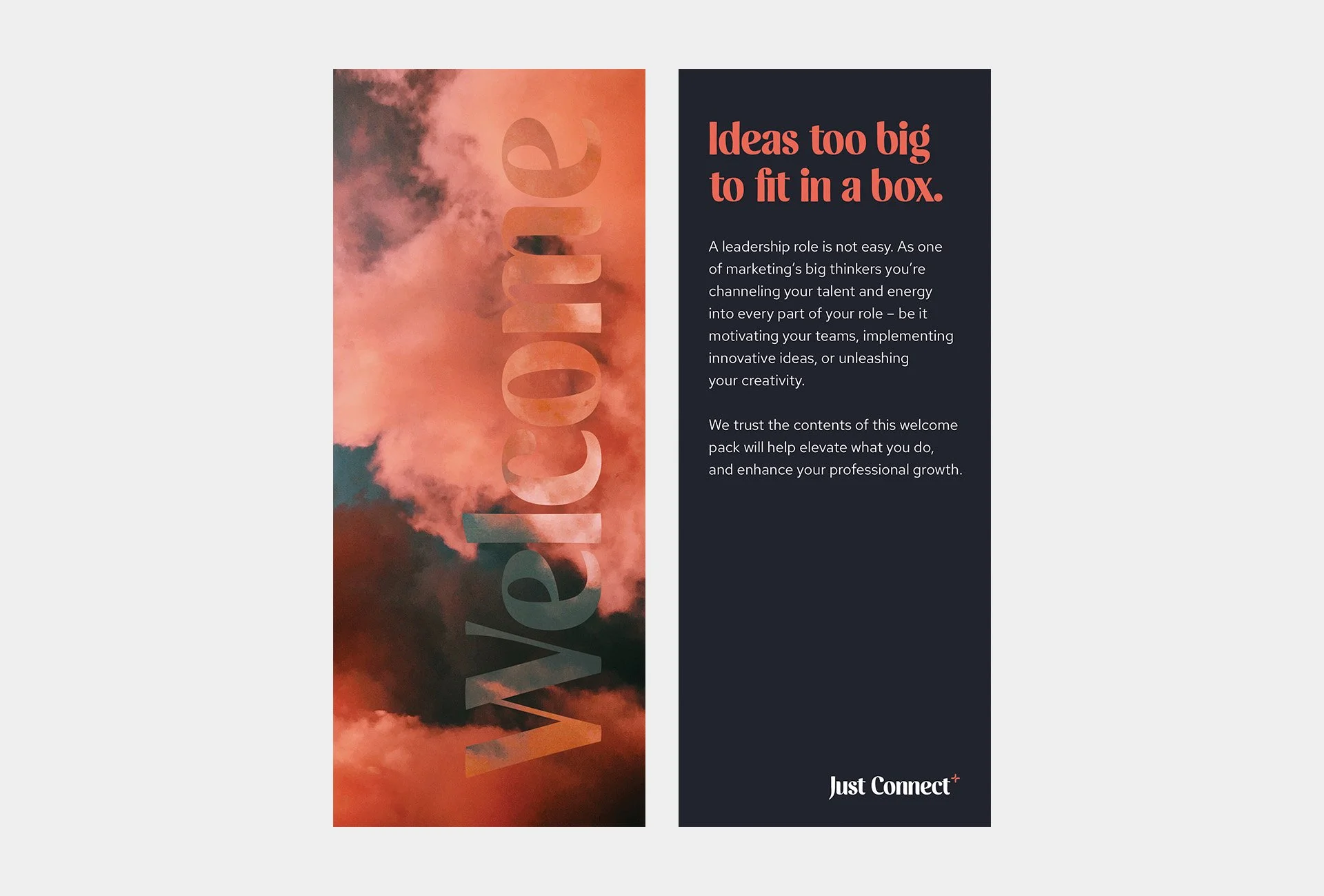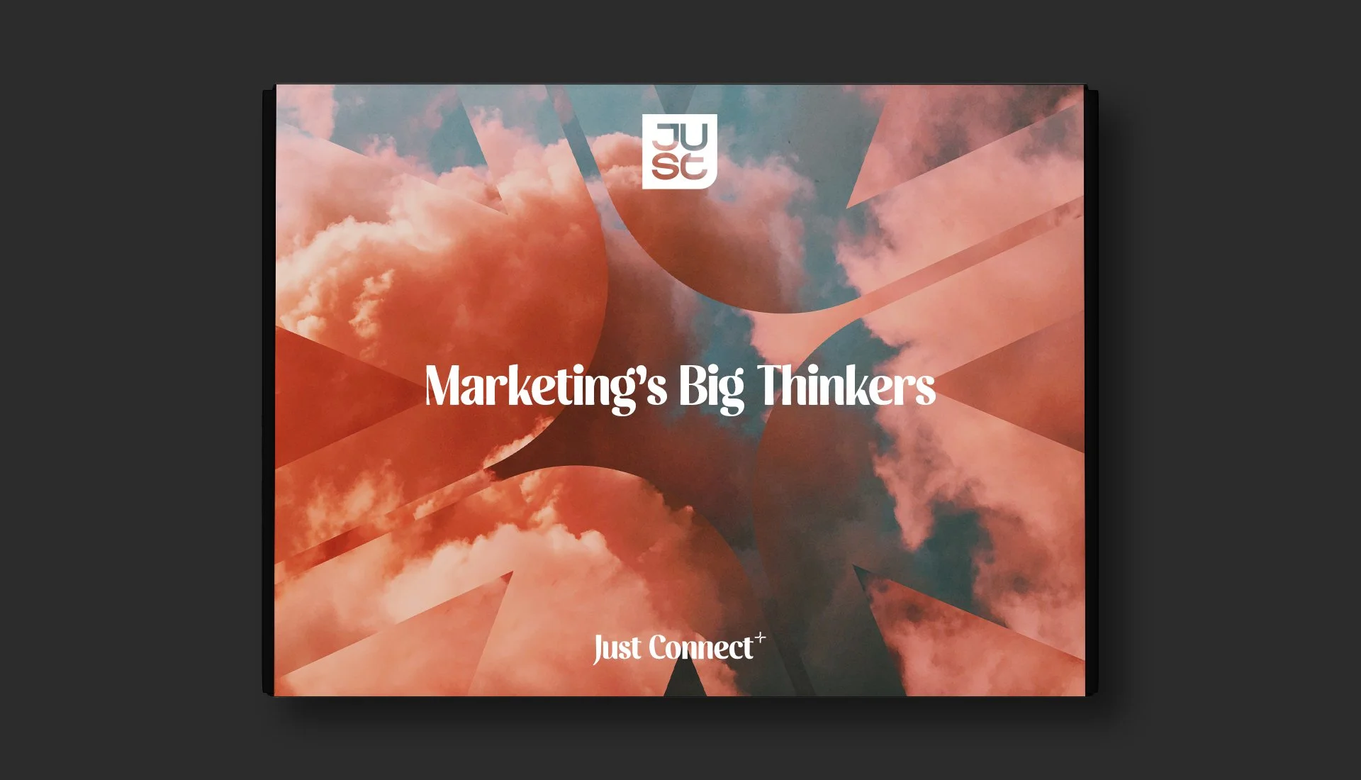 The visual identity reflects expansive thinking grounded in strategy: atmospheric cloudscapes intersect with structured geometric forms to balance imagination and precision, while a coral-to-ember palette against deep navy creates energy and depth. High-contrast serif headlines paired with restrained sans-serif typography convey authority and clarity, and bold composition and declarative messaging unify the system across various touchpoints, positioning Just Connect as an elevated space for marketing’s big thinkers to converge.