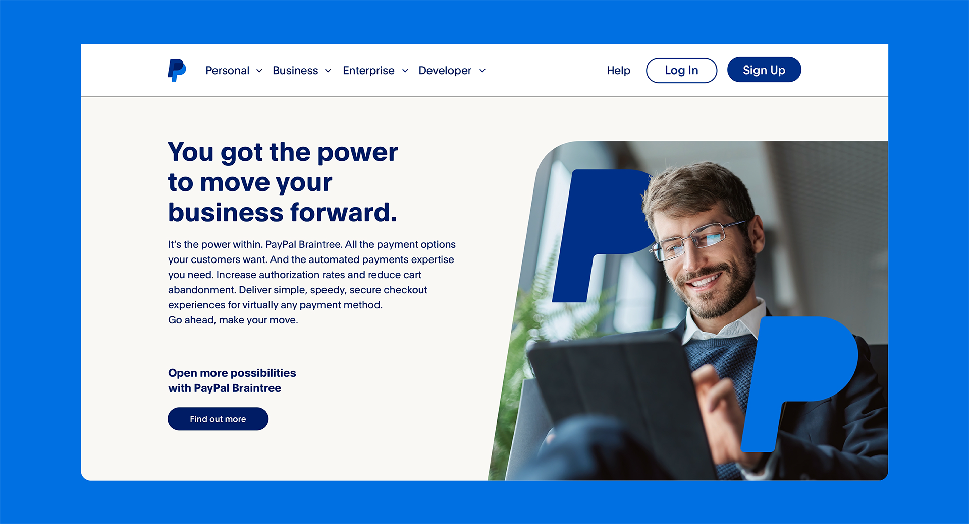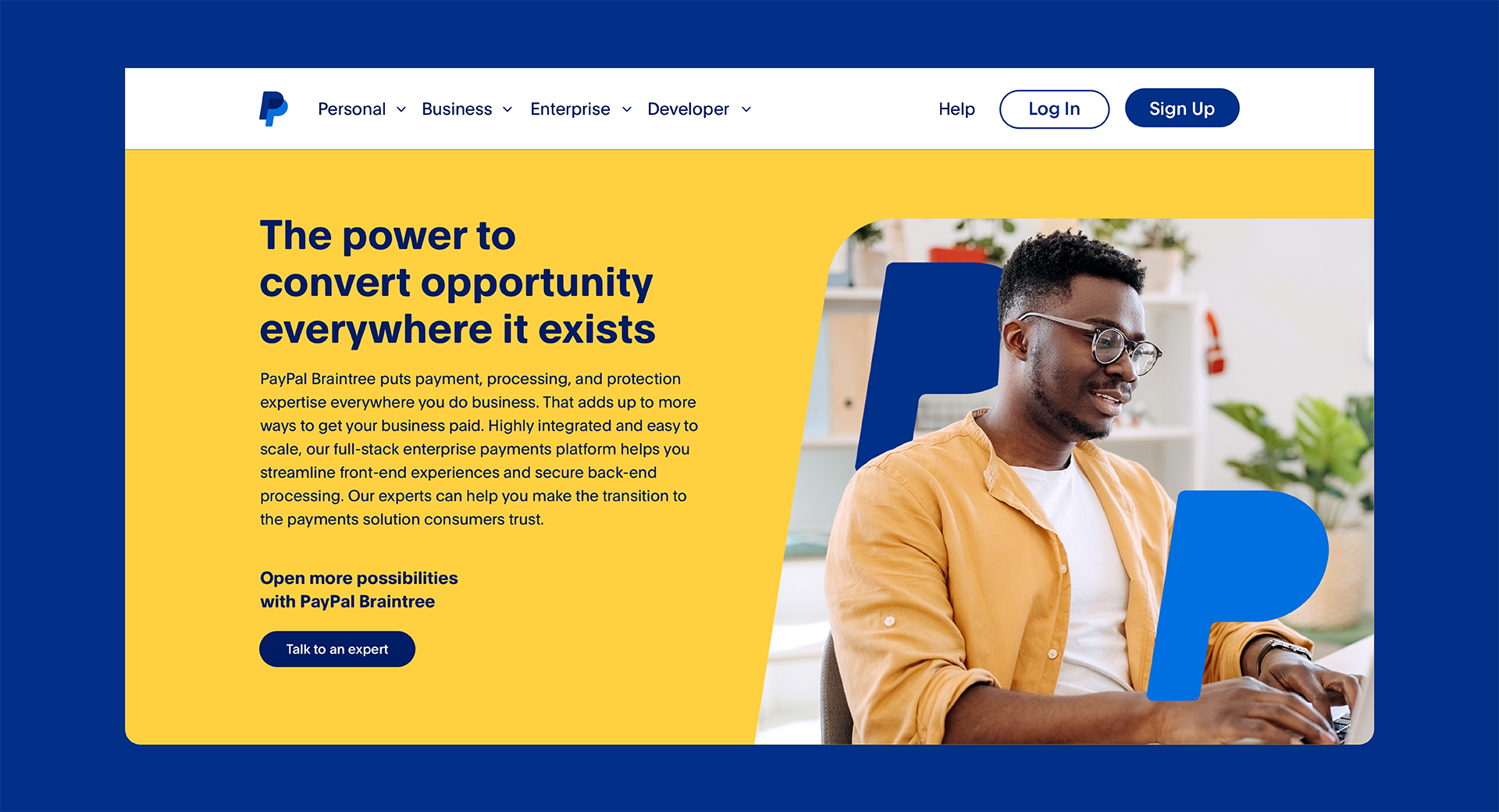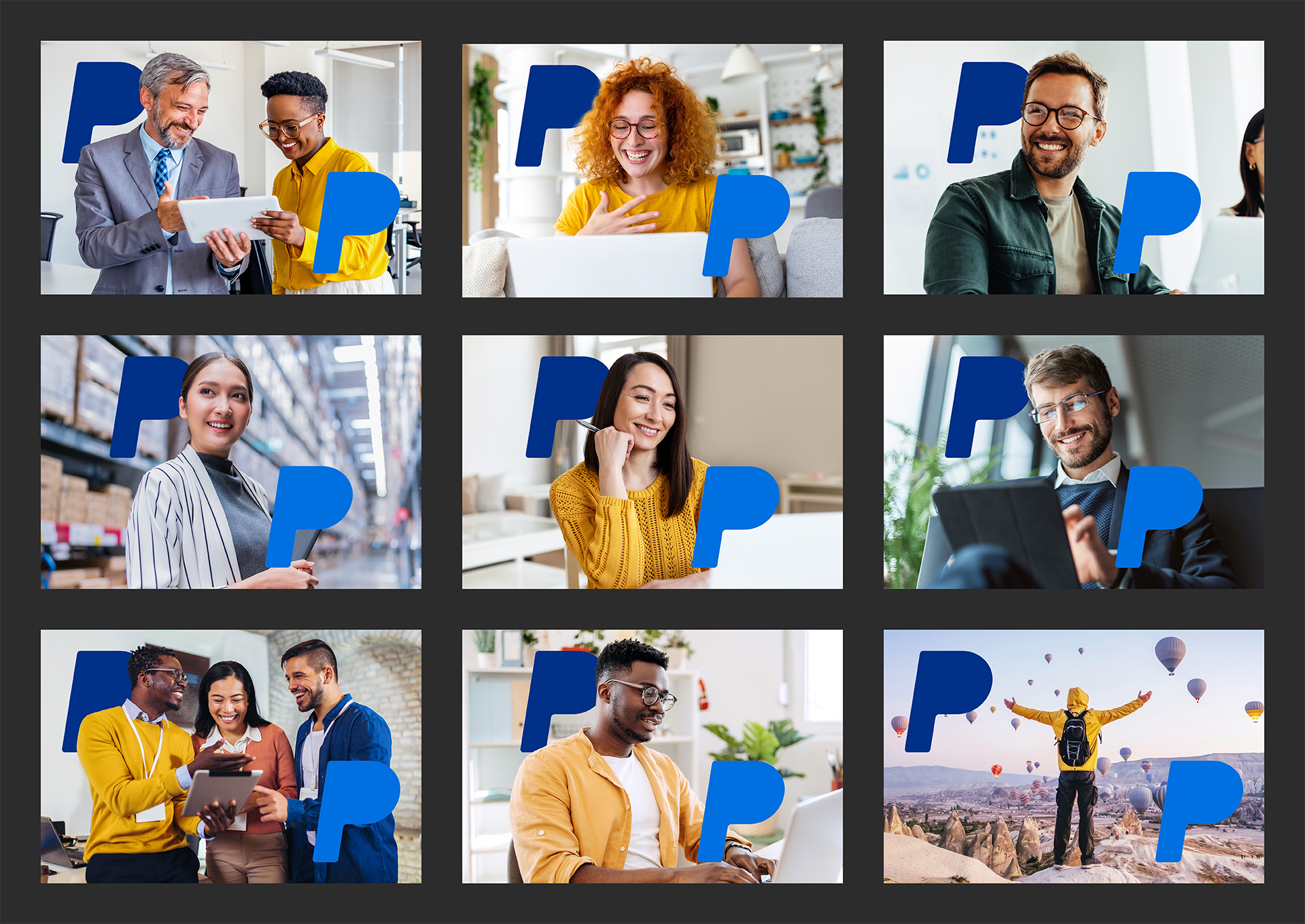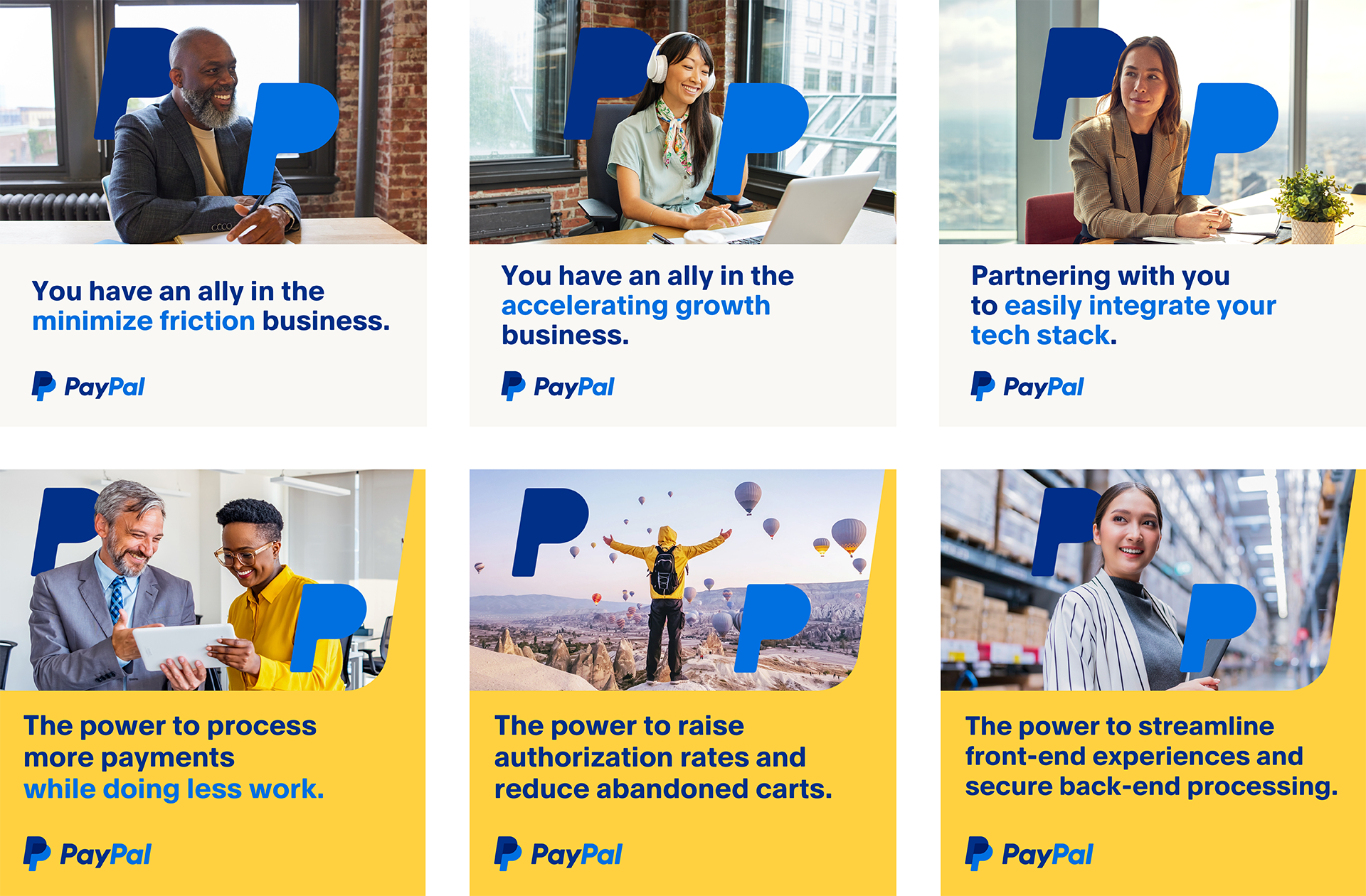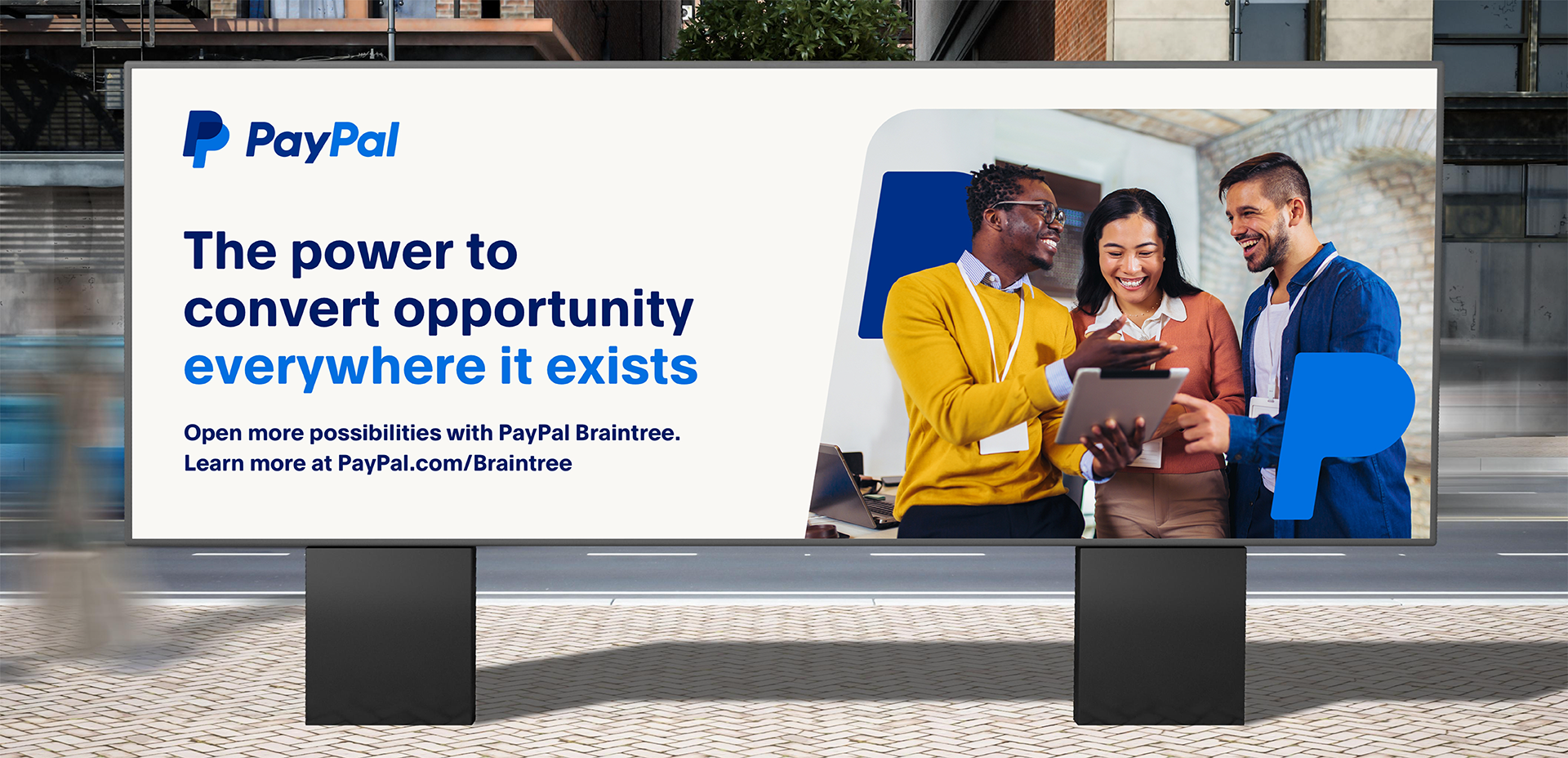 The campaign centered on the line “The Power to Convert Opportunity Everywhere It Exists.” A bold typographic system, PayPal’s blue and yellow palette, and oversized “P” graphics created a cohesive visual language across channels. Forward-moving photography reinforced partnership and growth.