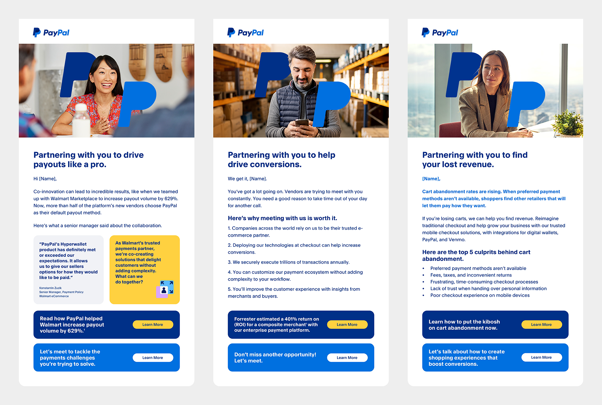 While PayPal had strong brand recognition, enterprise prospects needed a clearer articulation of measurable value. We shifted the focus from payment features to business outcomes, highlighting higher authorization rates, reduced cart abandonment, and seamless integration, while strengthening mid-funnel momentum and sales storytelling.