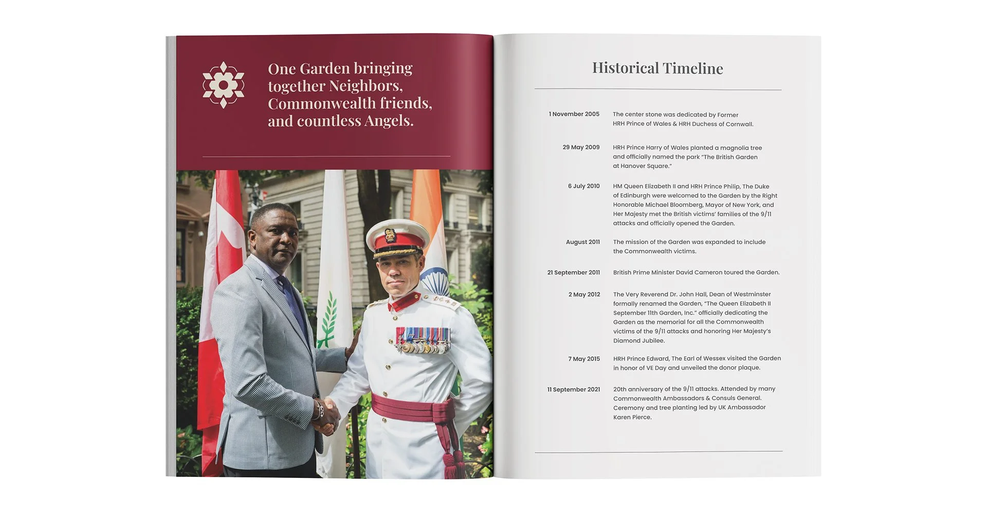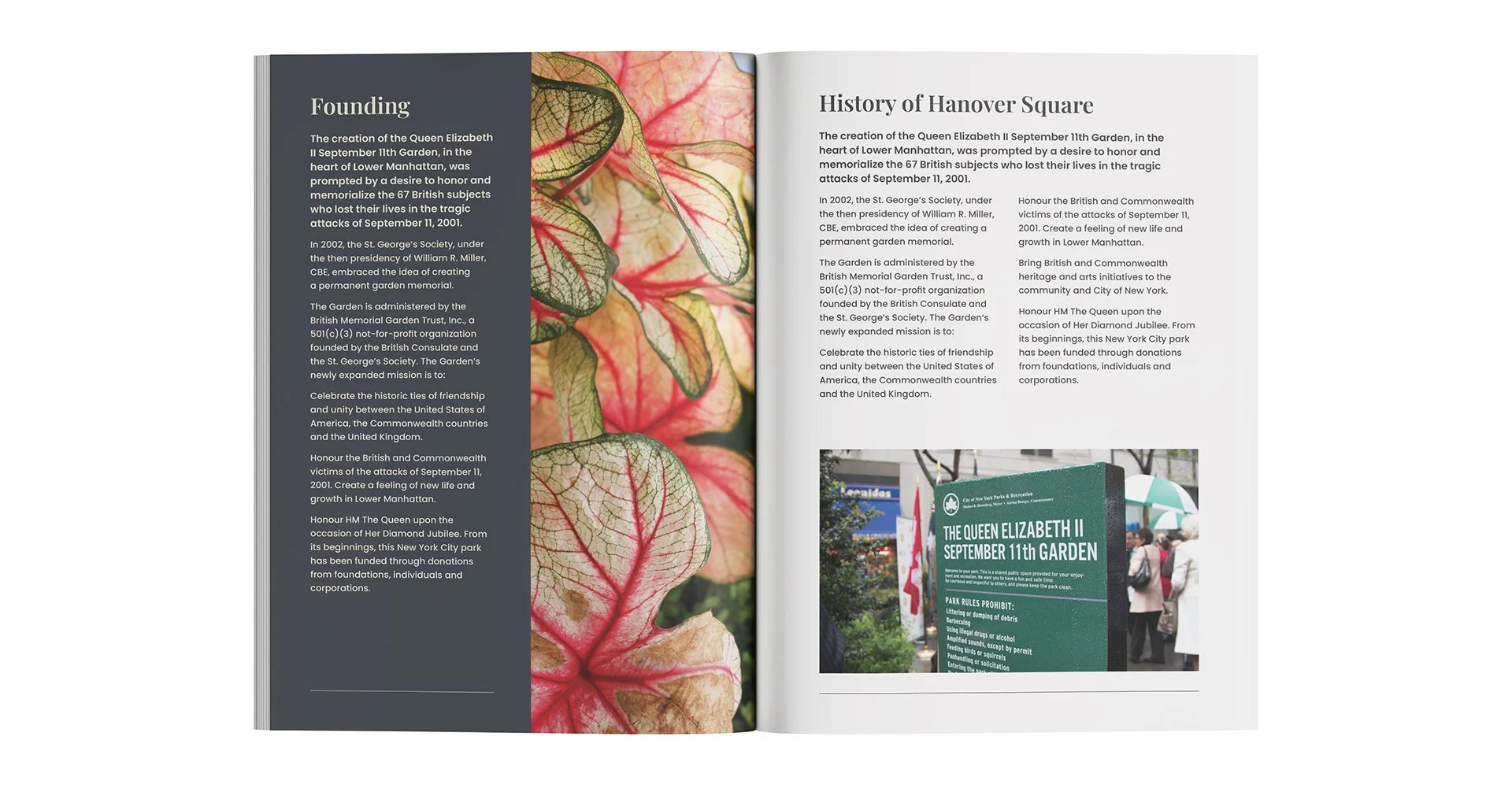 The Queen Elizabeth II September 11th Garden stands as a living memorial honoring the 67 British citizens who lost their lives on September 11, 2001, and the enduring alliance between the United Kingdom, the Commonwealth, and the United States.